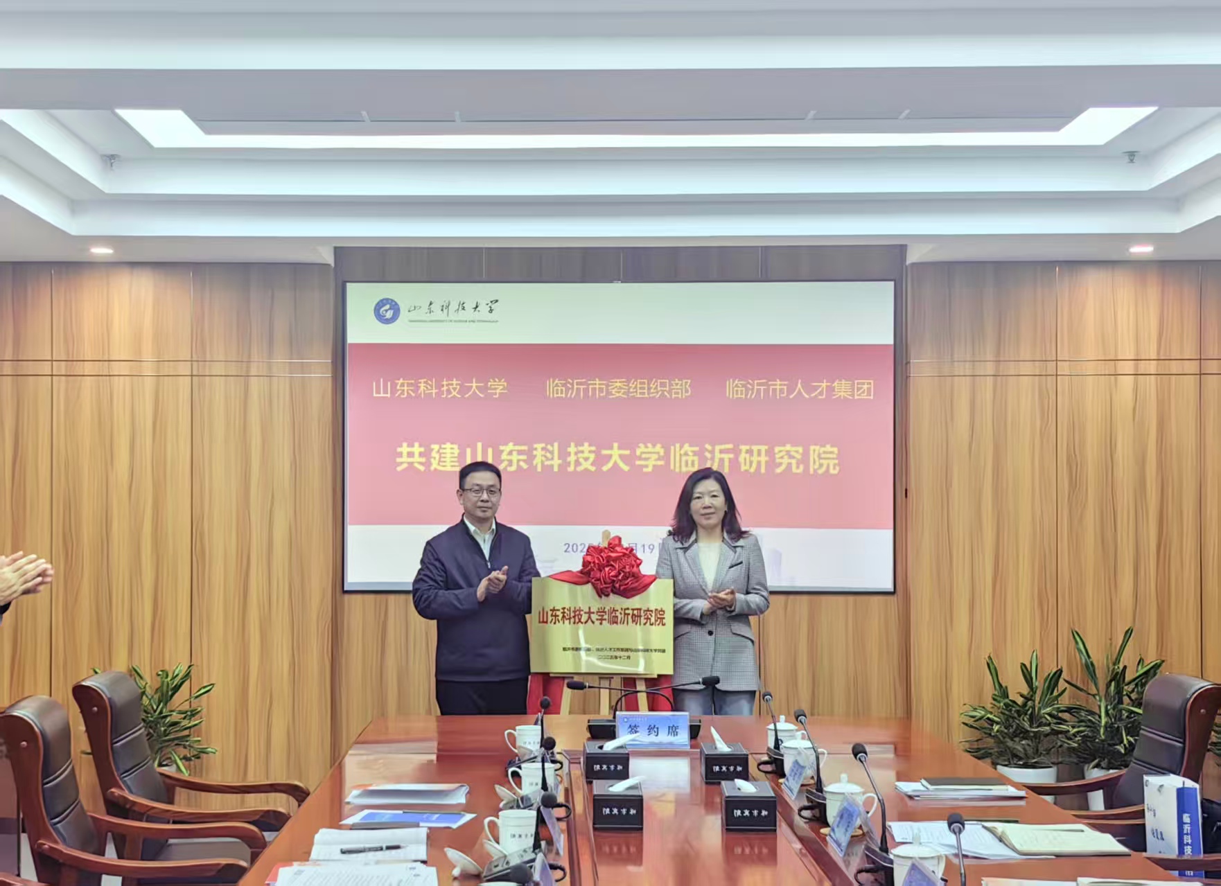 12月19日,山东科技大学与临沂市委组织部、临沂人才工作集团合作共建“山东科技大学临沂研究院”签约仪式在我校举行。校党委常委、副校长陈绍杰,临沂市委常委、宣传部部长张晓彬共同为研究院揭牌,标志着校地双方深化产学研协同创新、服务区域高质量发展迈入崭新阶段。
