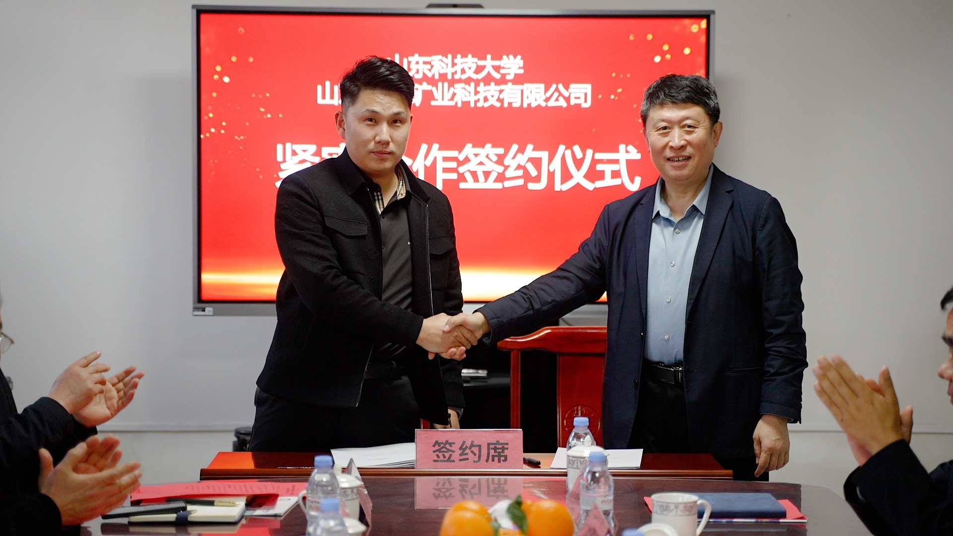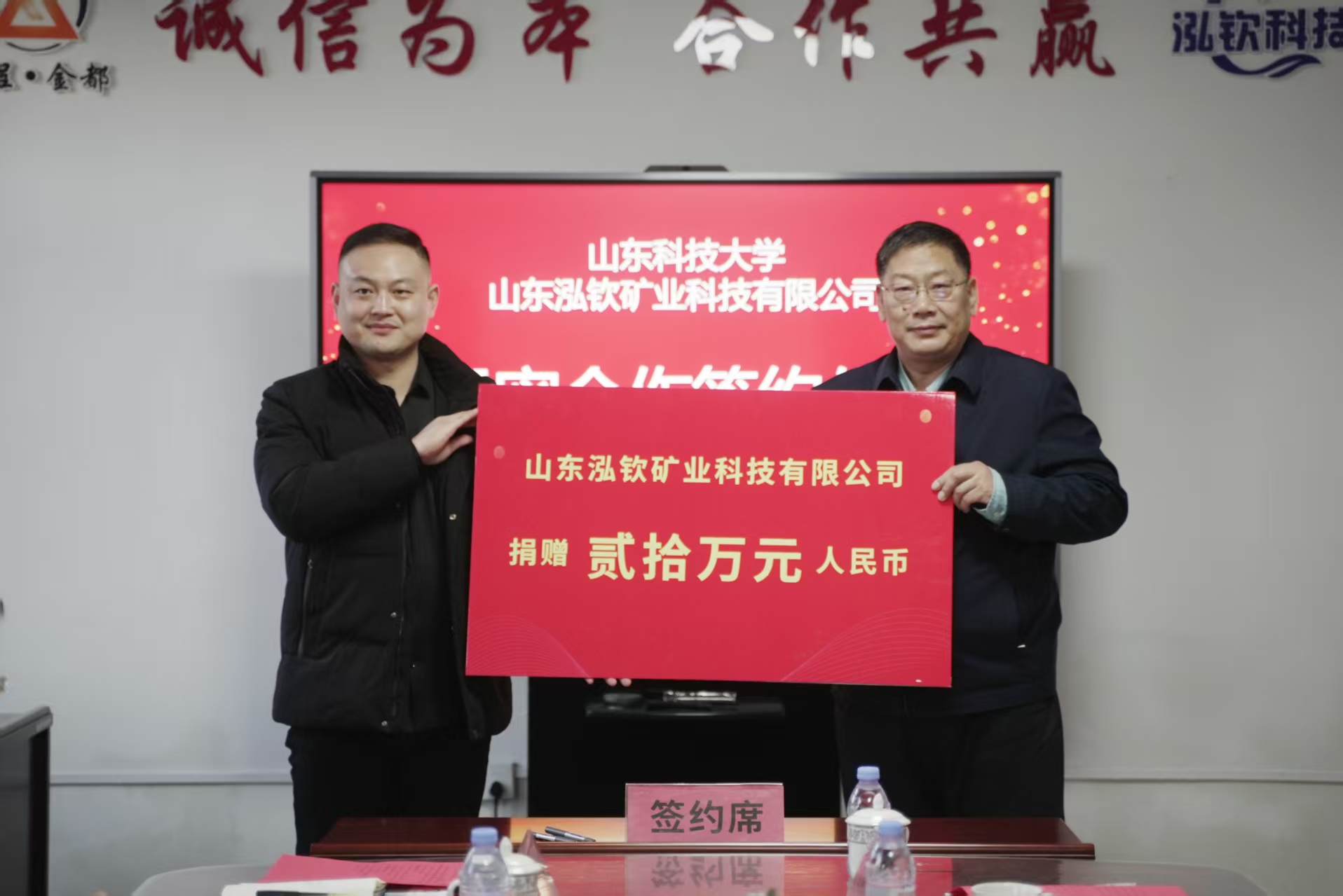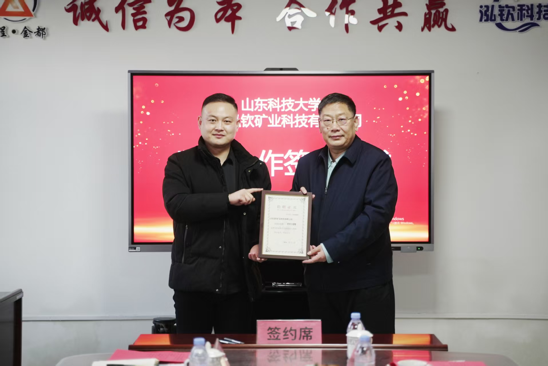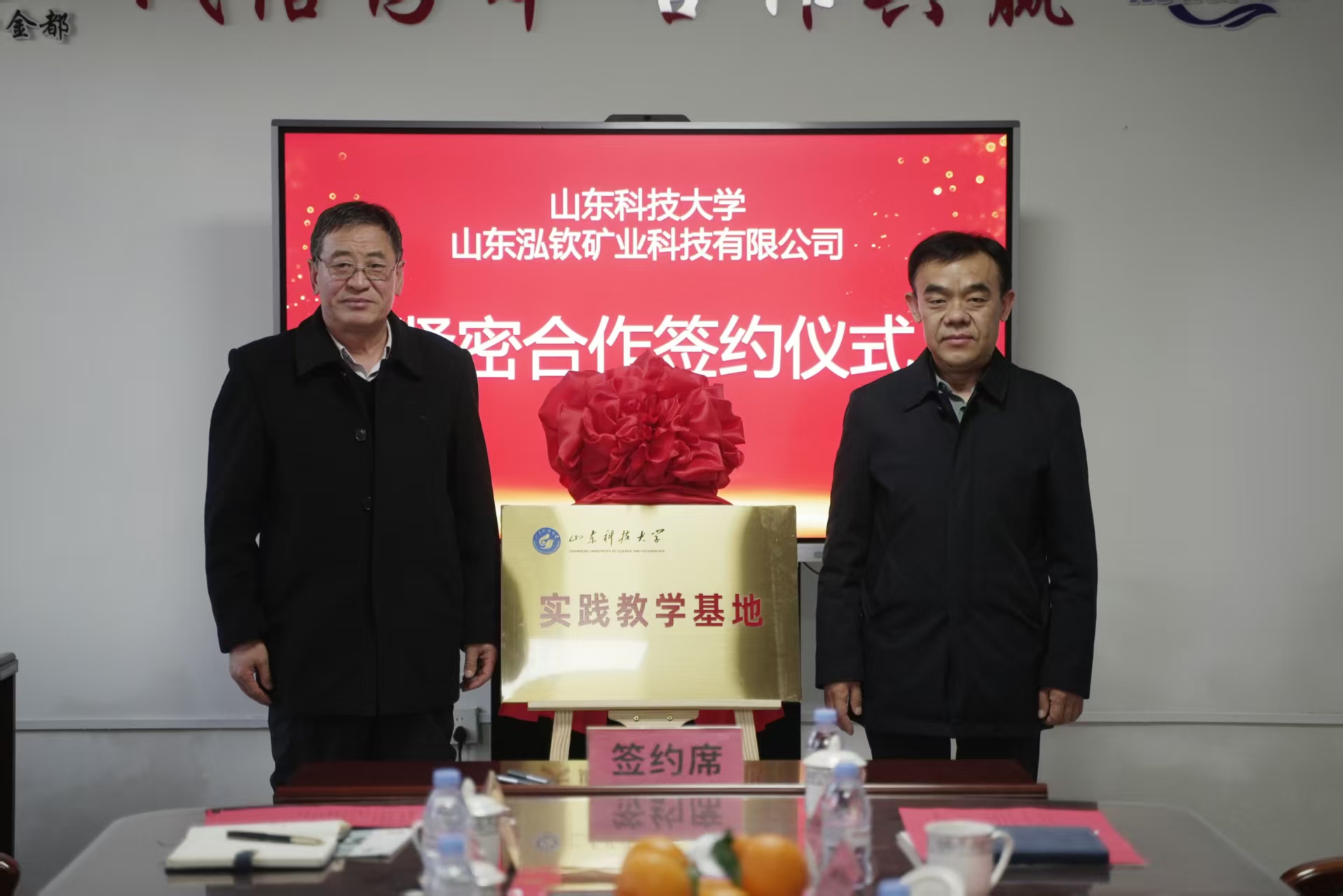 山东科技大学合作发展处处长王晓东与山东泓钦科技有限公司总经理李小亮代表双方签署了紧密合作协议及捐赠协议。能源与矿业工程学院党委书记卞西春与山东泓钦矿业科技有限公司总工程师于纪怀共同为“山东科技大学实践教学基地”揭牌。随后,双方围绕技术攻关、学生实习就业等议题进行了深入交流。