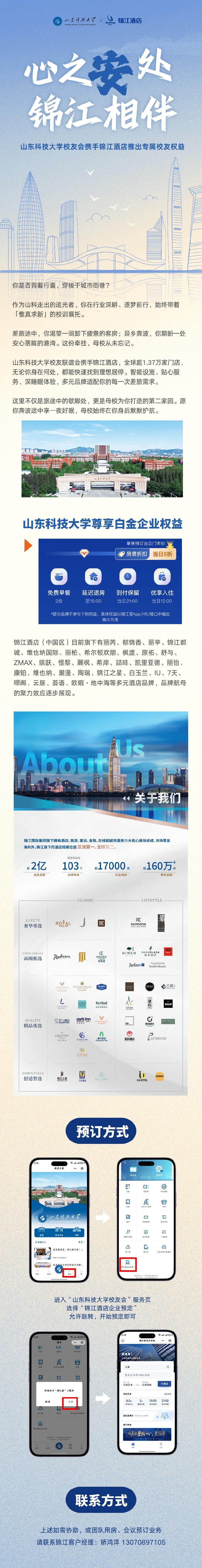 无论您奔赴何方,母校始终是你旅途中最温暖的惦念。为感谢每一位校友的深厚情谊,助力大家的每一次相聚与远行,山东科技大学校友总会携手锦江酒店集团,为您献上一份专属的出行礼遇。
