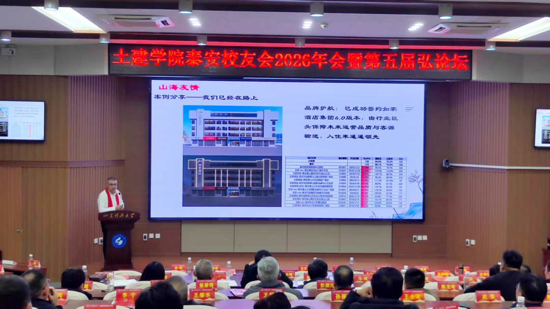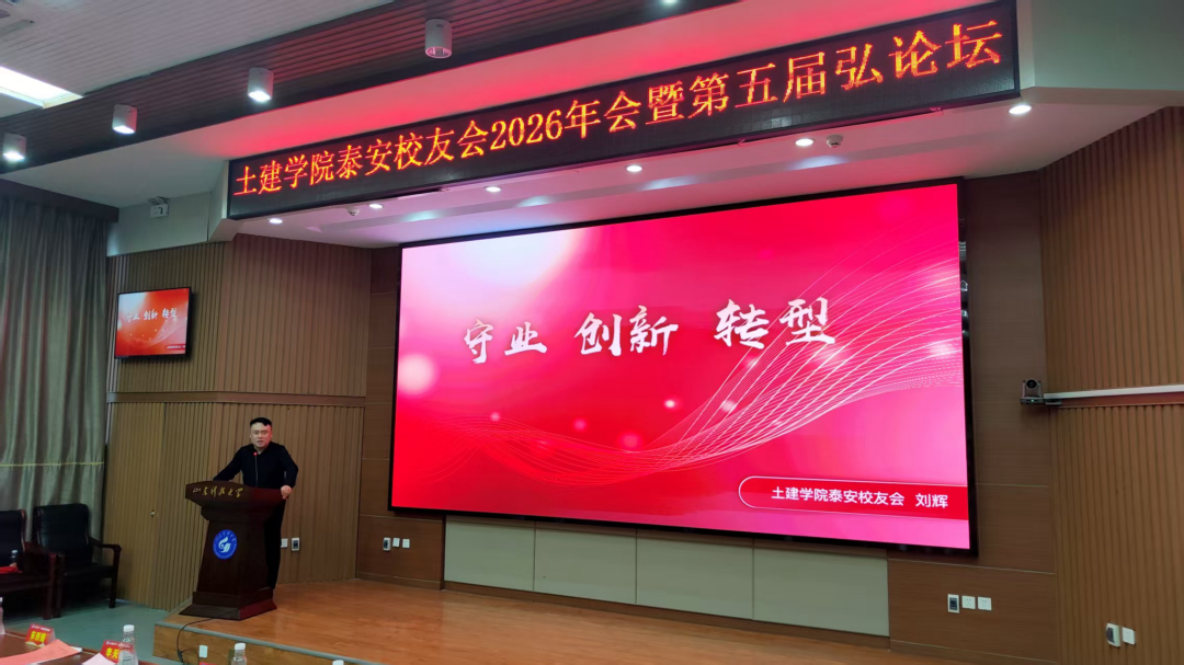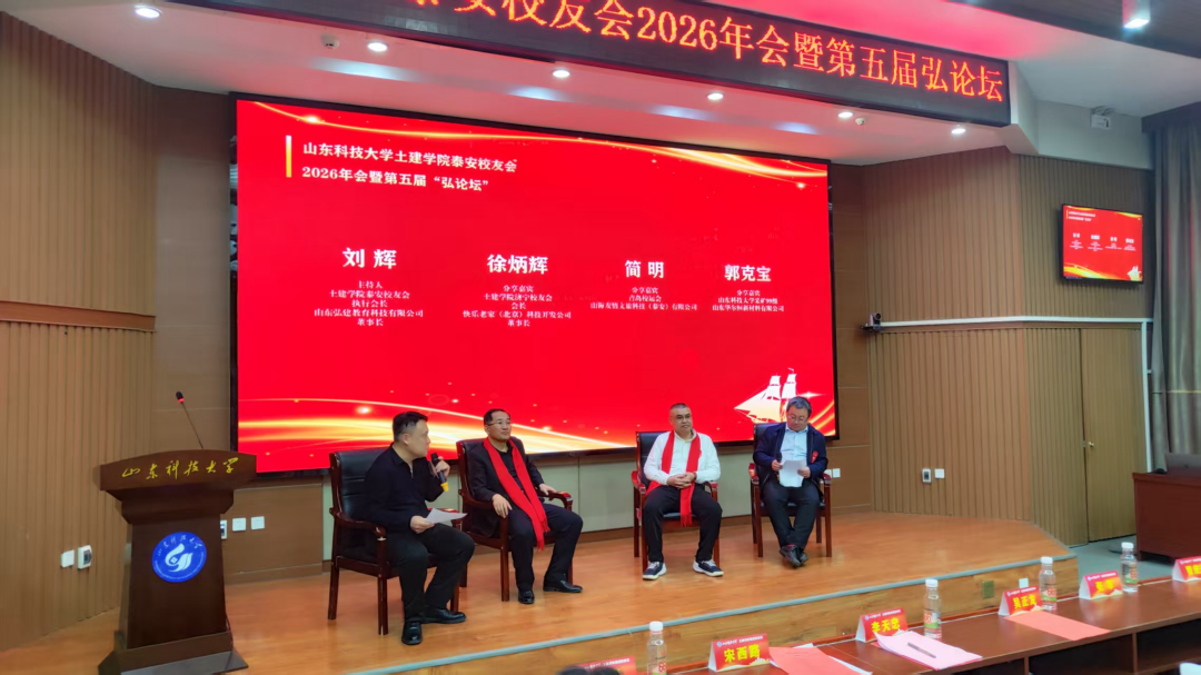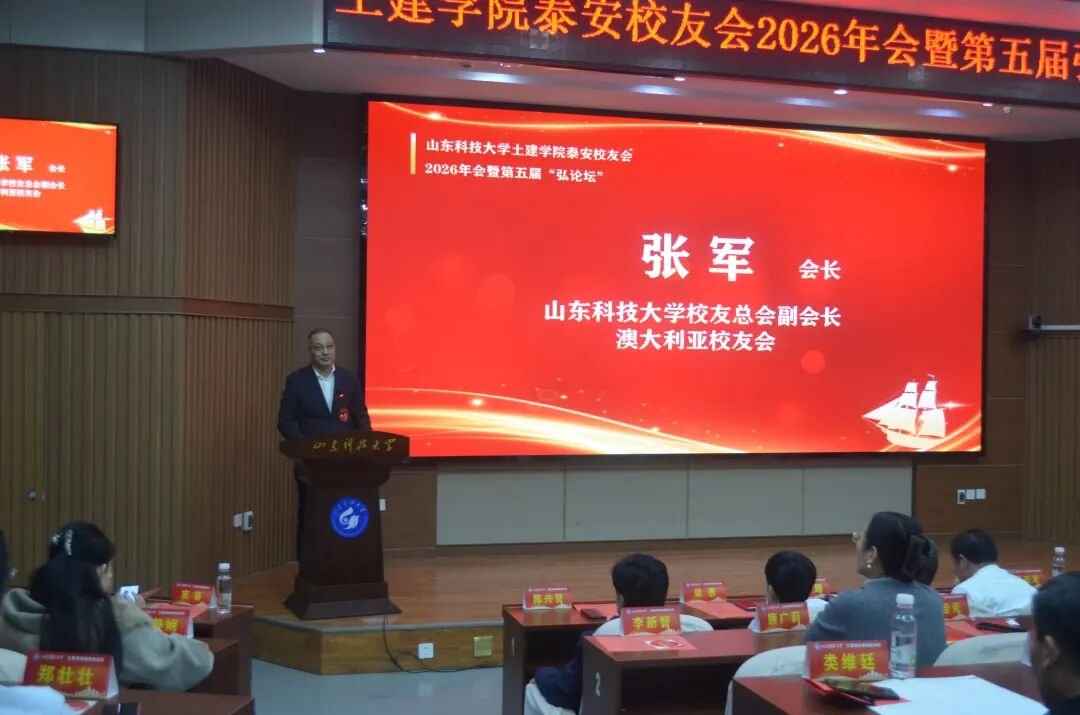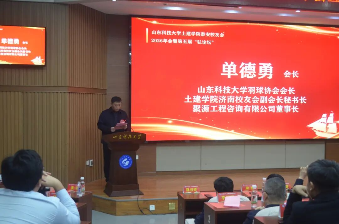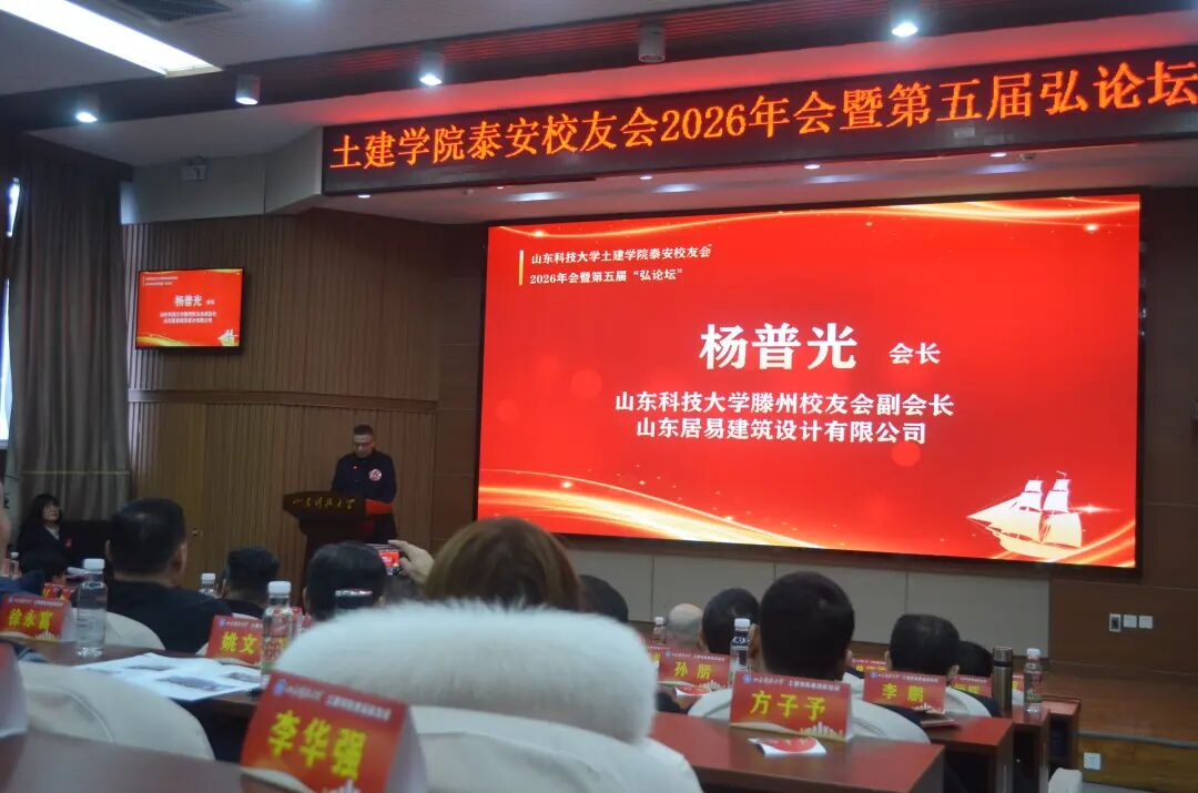 岁序更替,华章日新。2026年1月10日,山东科技大学土建学院泰安校友会2026年会暨第五届“弘论坛”在泰安校区1号楼报告厅隆重召开。本次活动以“校友聚力 智汇泰安”为主题,汇聚了学校领导、学院师生代表、各地兄弟校友会嘉宾及相关企业负责人,共叙校友情谊、共话行业发展、共绘合作蓝图。