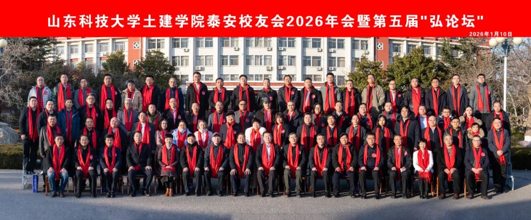 活动最后,全体参会人员在校园内合影留念,定格下这一凝聚情谊、共话未来的珍贵时刻。此次山东科技大学土建学院泰安校友2026年会暨第五届“弘论坛”的成功举办,不仅为广大校友搭建了沟通交流、资源对接的坚实平台,更凝聚了校友力量、汇聚了发展共识。未来,相信在母校与校友的同心协力下,将持续深化产学研用合作,推动校友经济蓬勃发展,为土木建筑行业的创新转型与地方经济社会发展贡献更大的山科力量!(土建学院泰安校友会供稿)