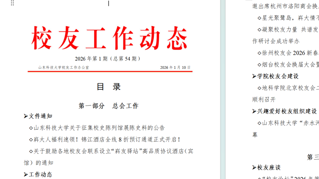返回岁序更替,华章日新。值此喜迎新春之际,山东科技大学校友总会、校友工作办公室向长期关注、支持母校发展的海内外校友致以最诚挚的新春问候与最美好的祝福!过去一年,母校的每一份进步与荣光,都离不开您的深切关注与鼎力支持。在此,我们谨向所有心系母校的校友,表达最衷心的感谢!