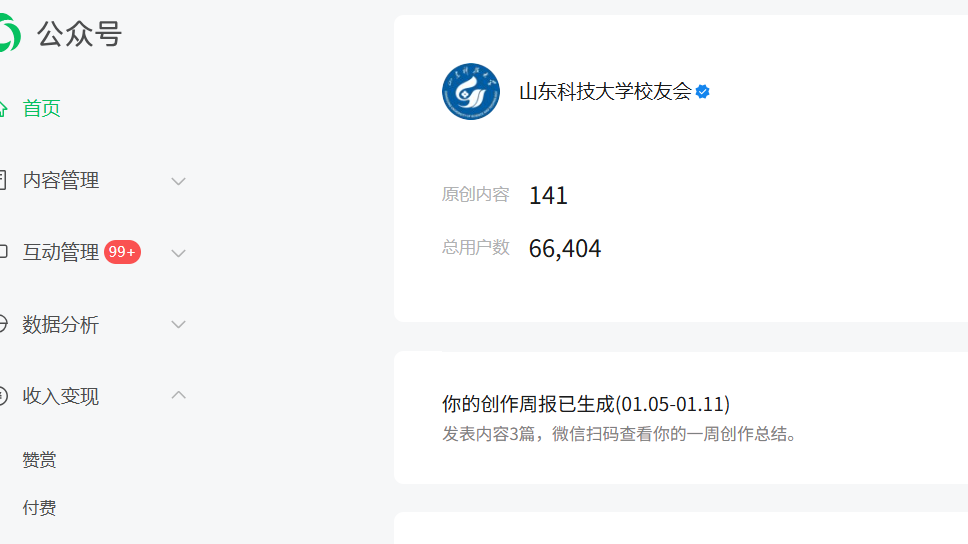 2.加强校友总会公众号运营,全年推送公众号153余期,累计推送公众号1818期,全年新增关注量12377人,关注总量65796人。